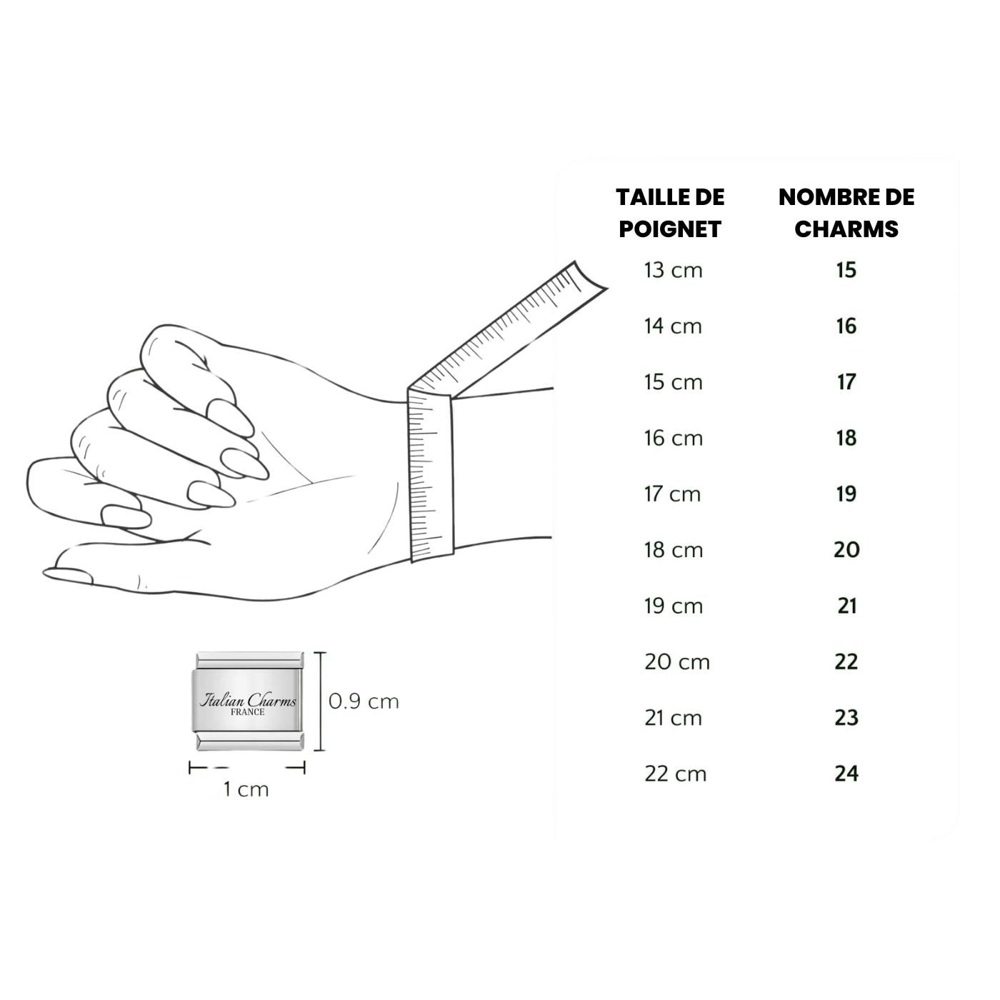 Si vous voulez être sûr de commander suffisamment de charms, il est recommandé de mesurer votre poignet. Vous faites cela avec un simple ruban à mesurer. Le calcul est très simple : votre tour de poignet (en cm) + 2 = la quantité de charms dont vous avez besoin. Dans ce tableau, nous l'avons écrit pour vous !