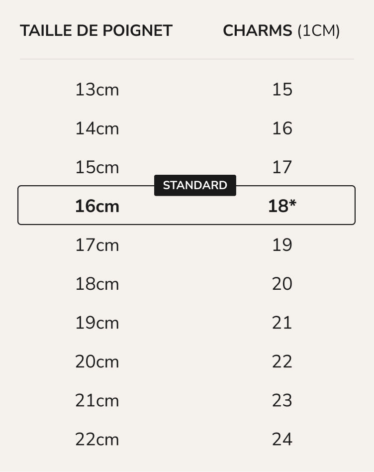 Guide des tailles : Nos bracelets sont disponibles en taille unique de 18 charms unis* pour s’adapter au plus grand nombre. Vous pouvez simplement ajouter ou retirer des charms pour ajuster la longueur et l’adapter parfaitement à votre poignet.
